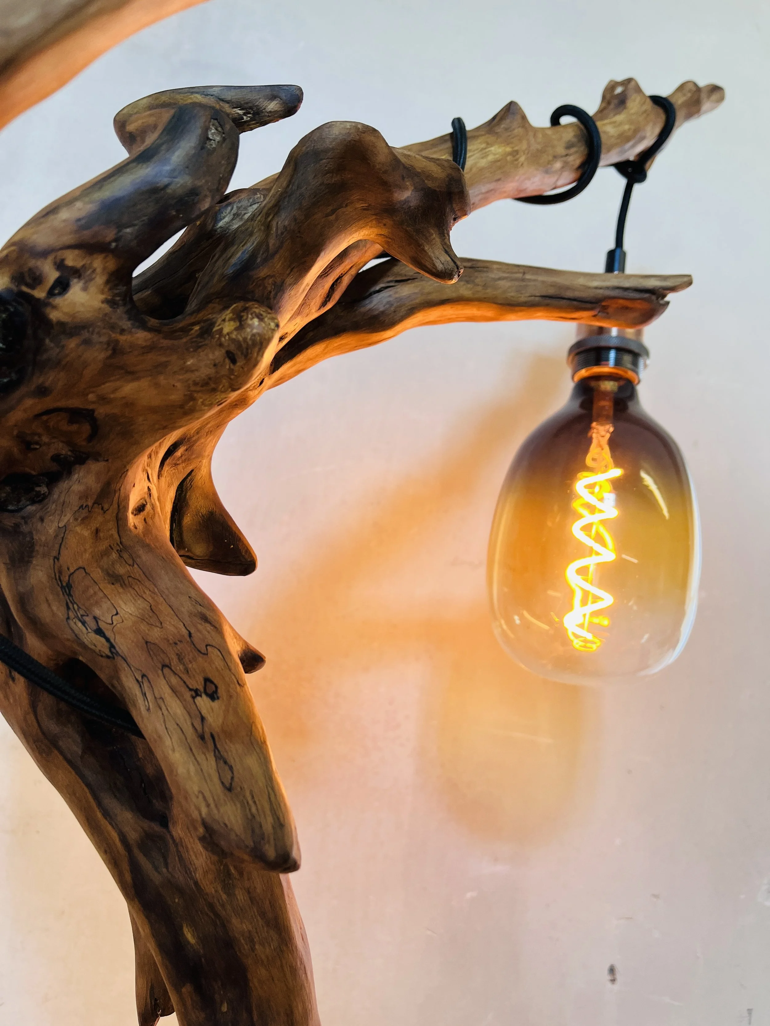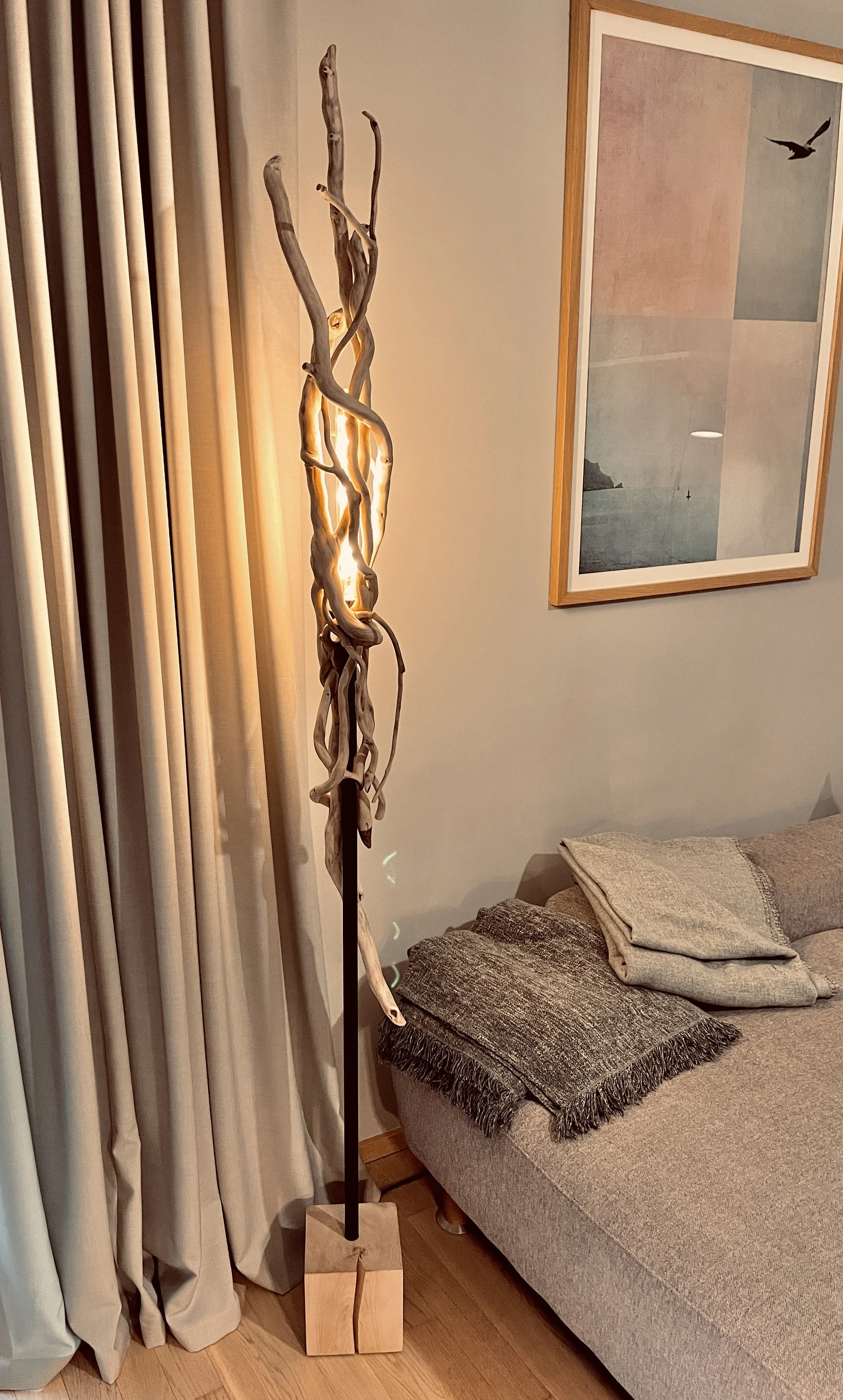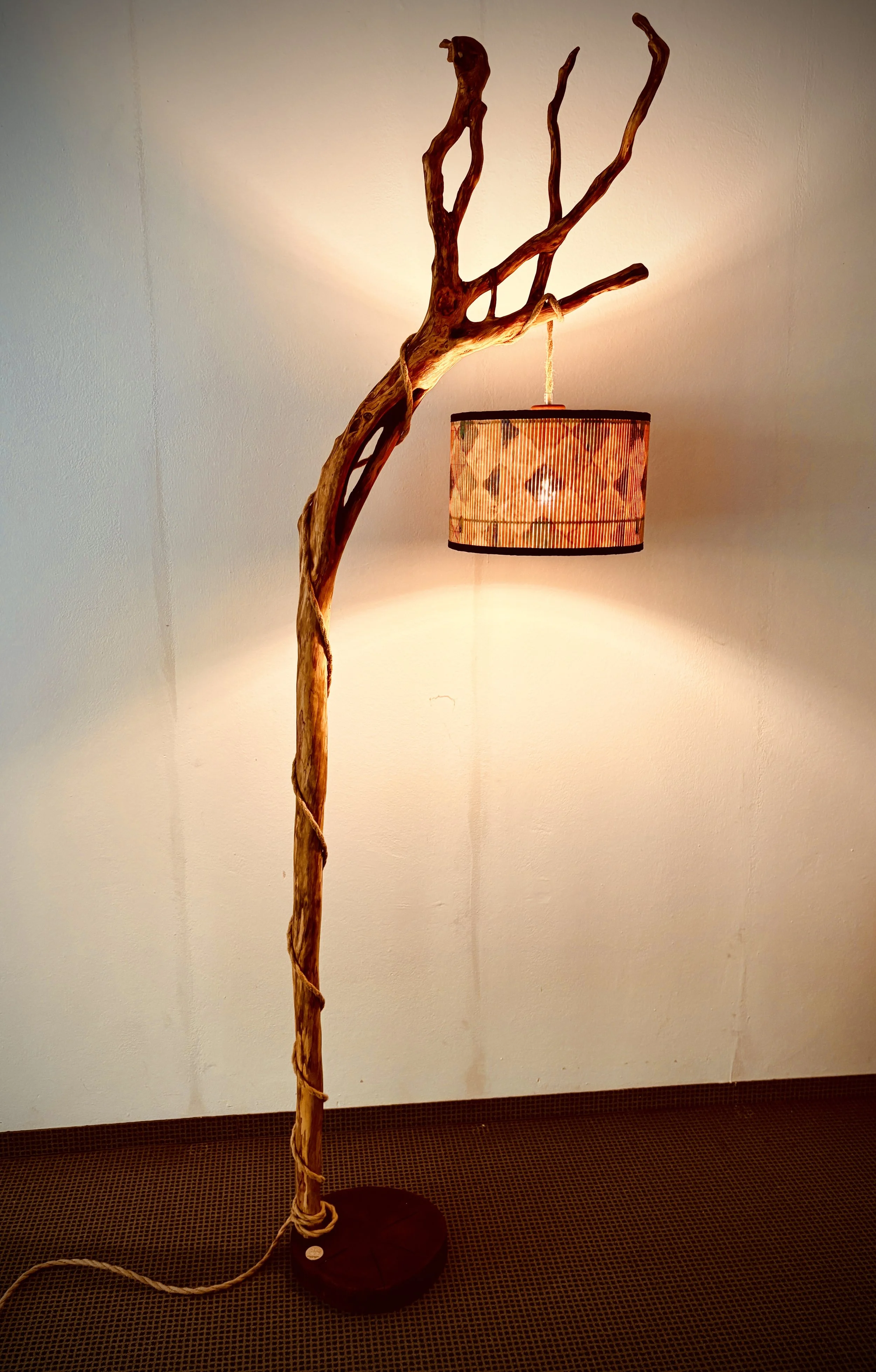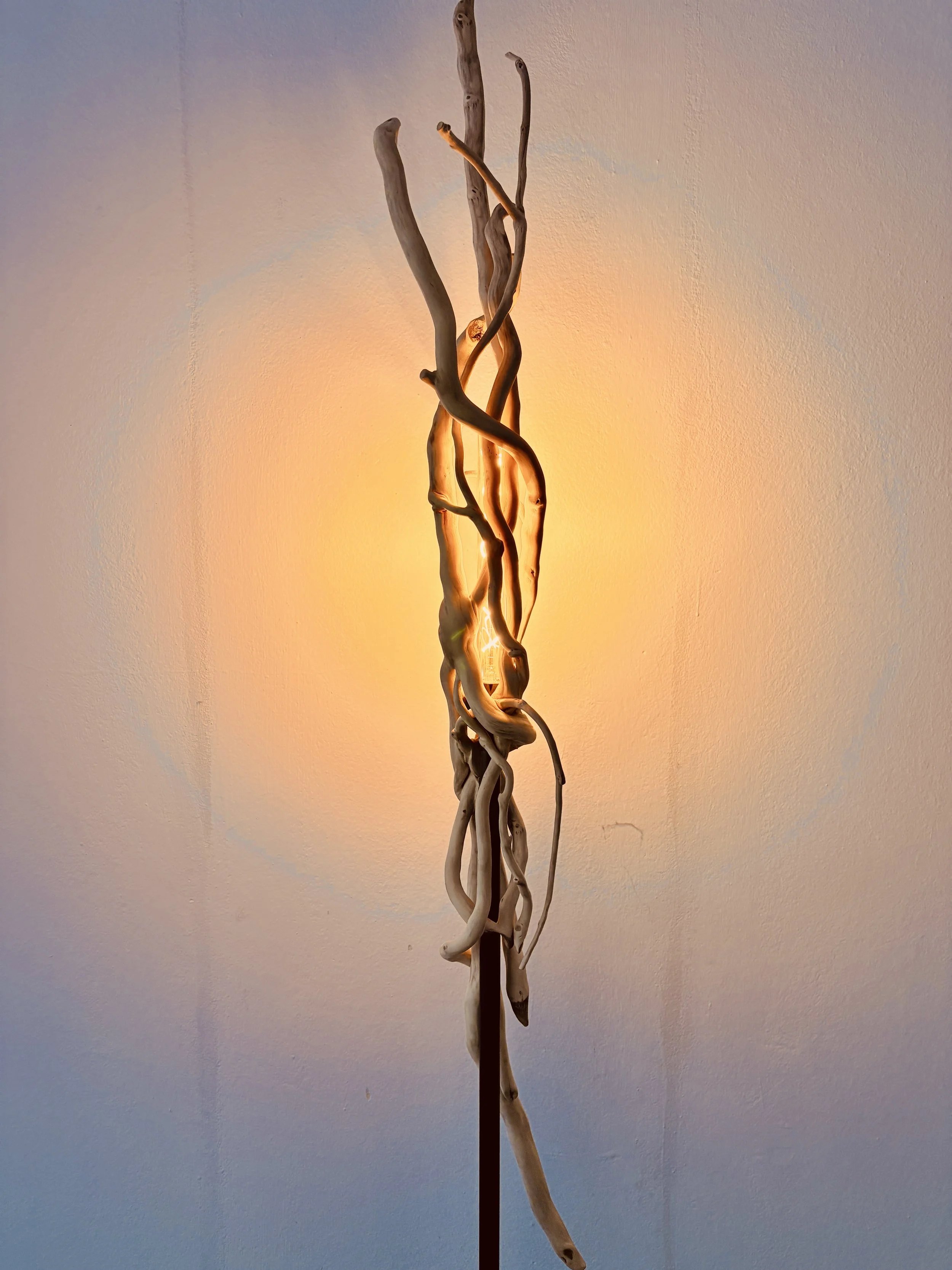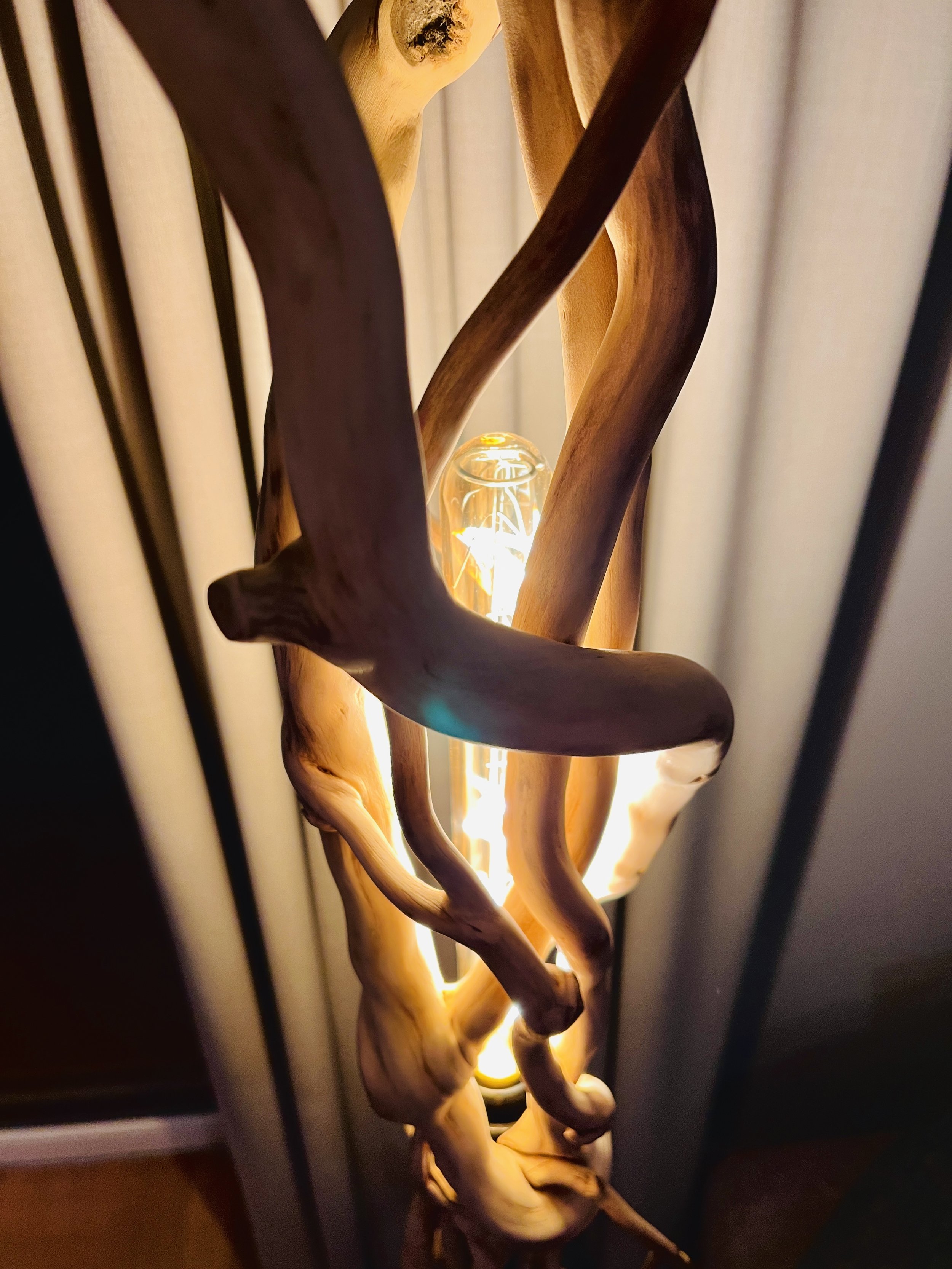 Eine elegante Stehlampe mit kunstvoll gestalteten Holzästen, die das Licht einer Glühbirne umgeben.