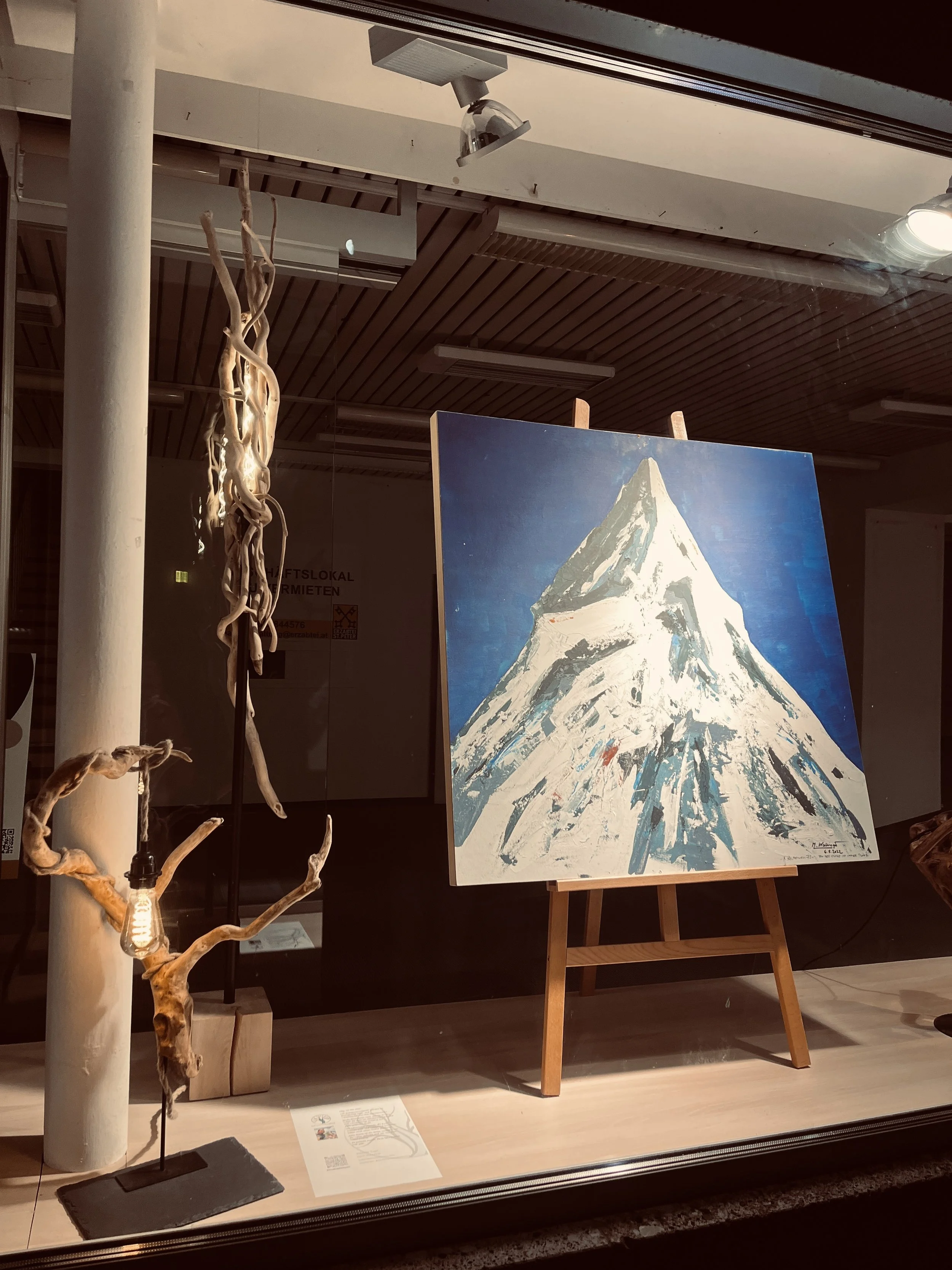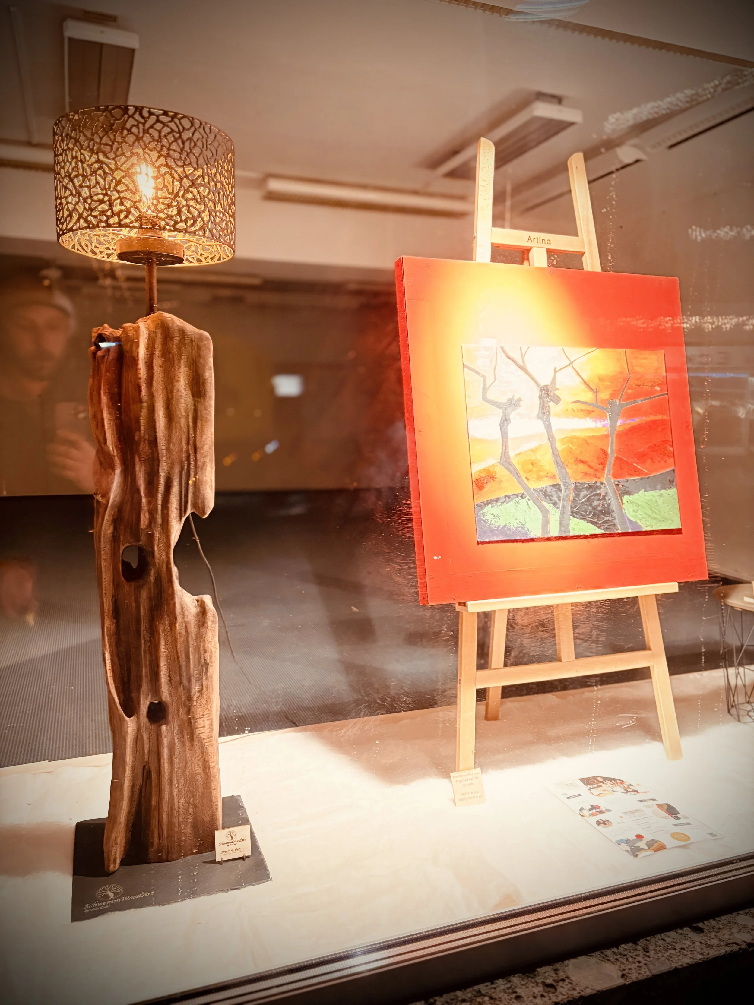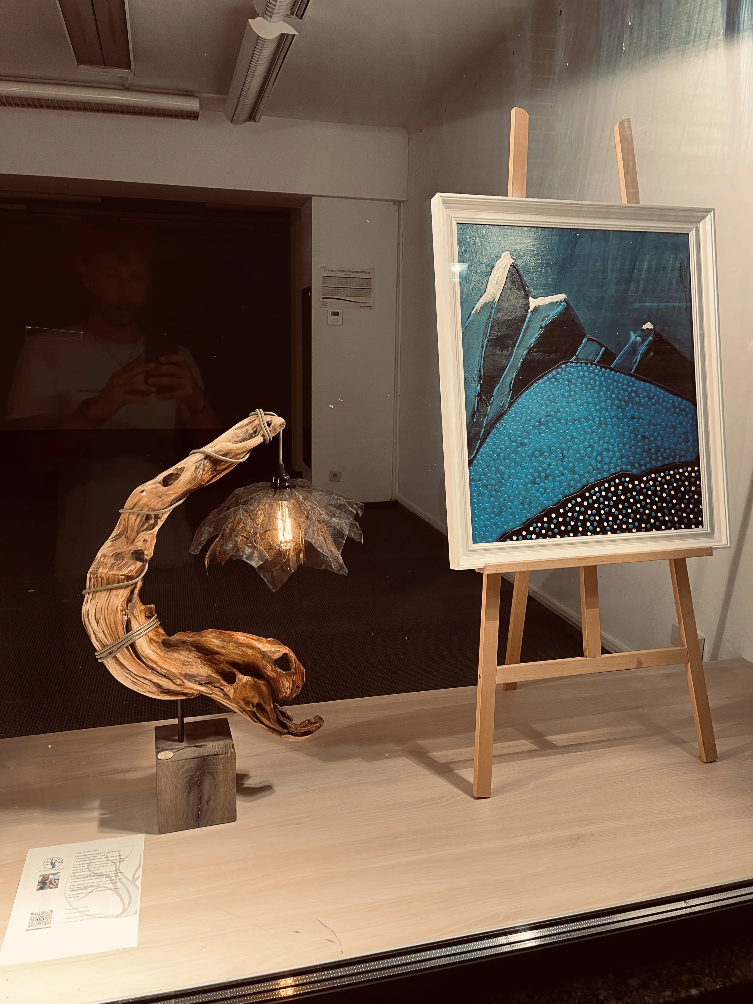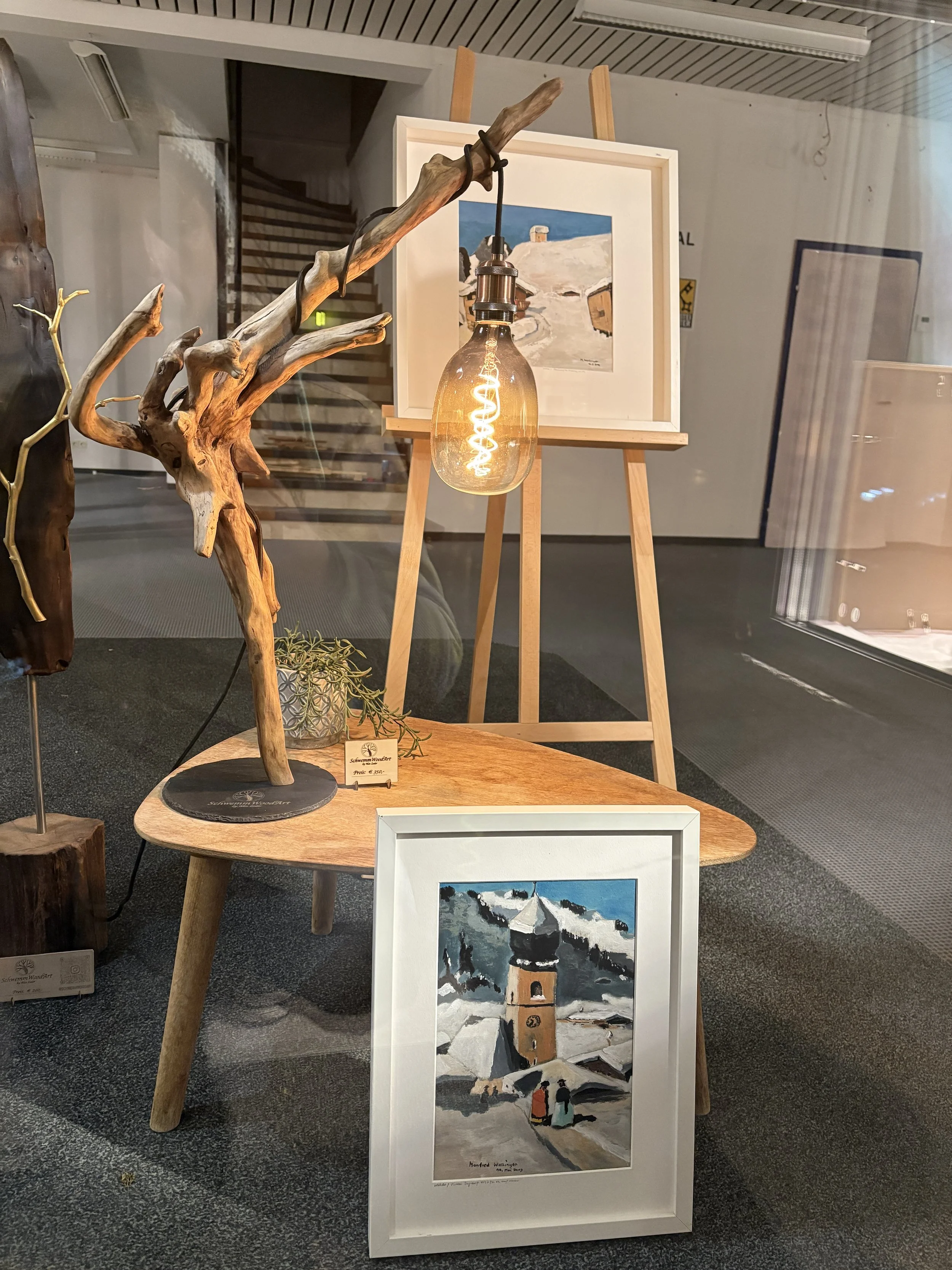 Kunstwerke in einer Galerie, bestehend aus einer Holzlampe und einem signierten Gemälde mit Bergen auf einer Staffelei.