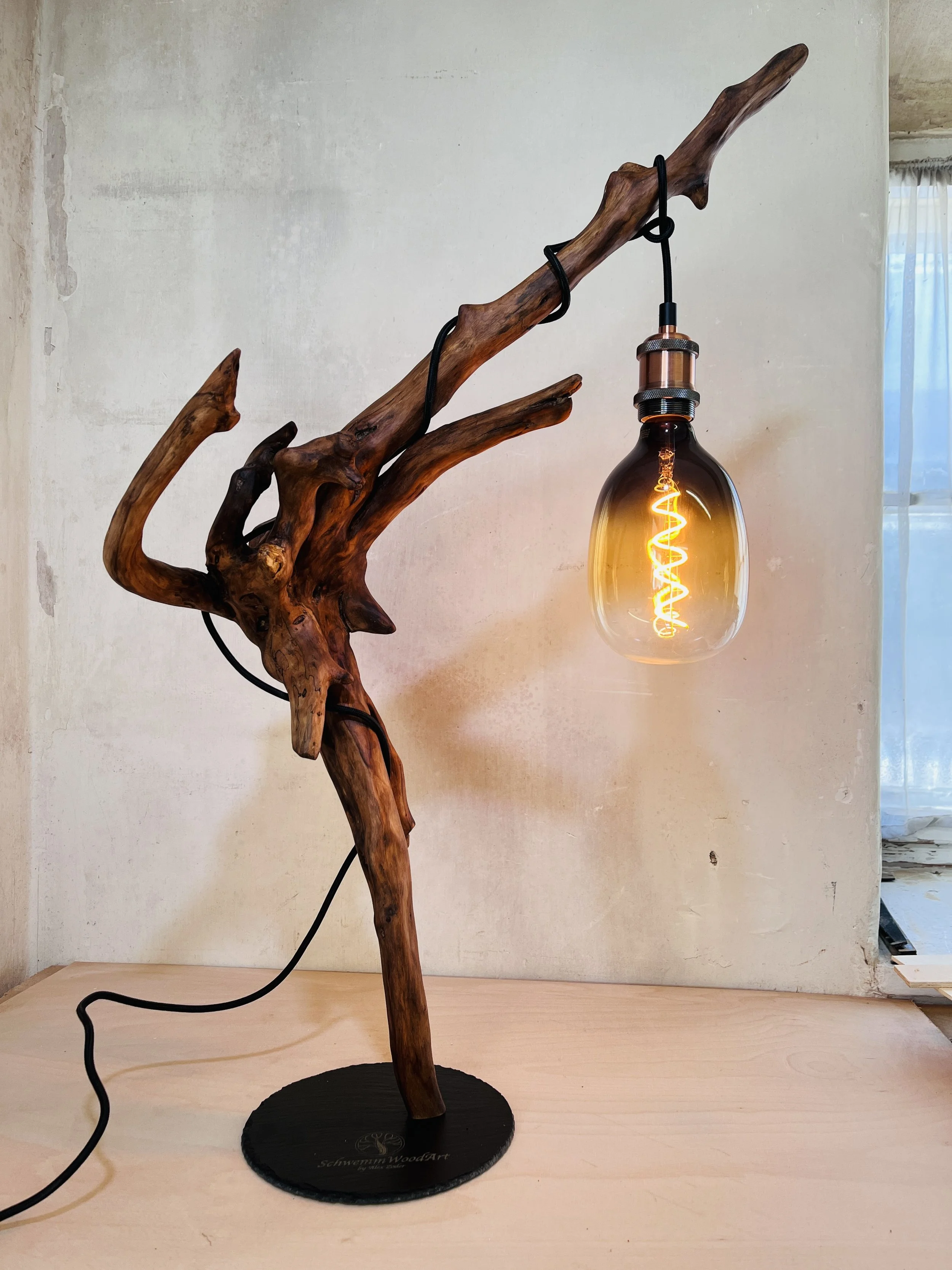 Eine dekorative Lampe mit einem zerzausten Holzarm, von dem ein leuchtender Glühbirnenschirm hängt.