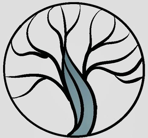 Ein stilisiertes Baumdesign mit schwarzen Linien, bläulichen Zweigen und dem Text "SchwemmWoodArt by Alex Zoder" darunter.