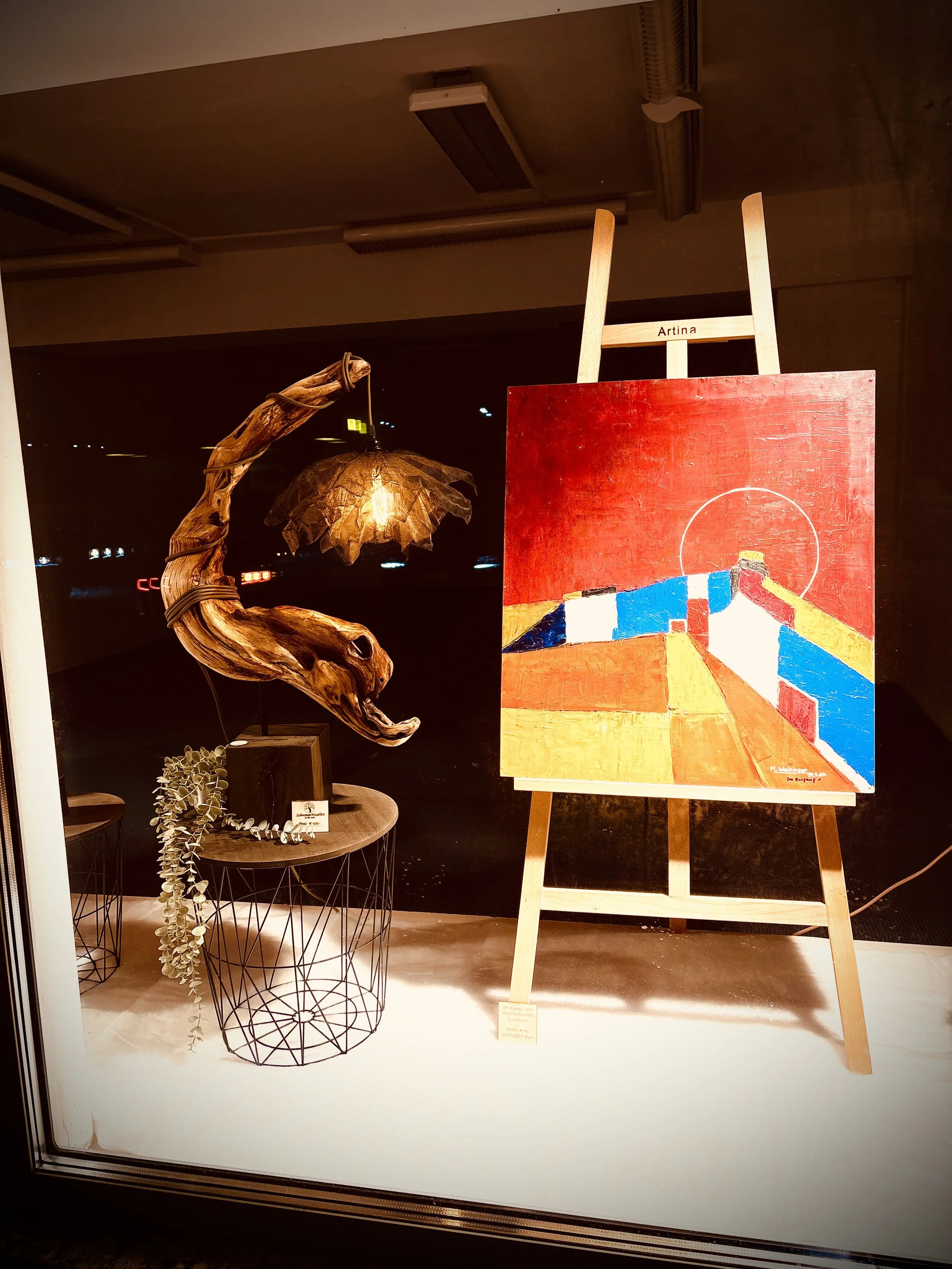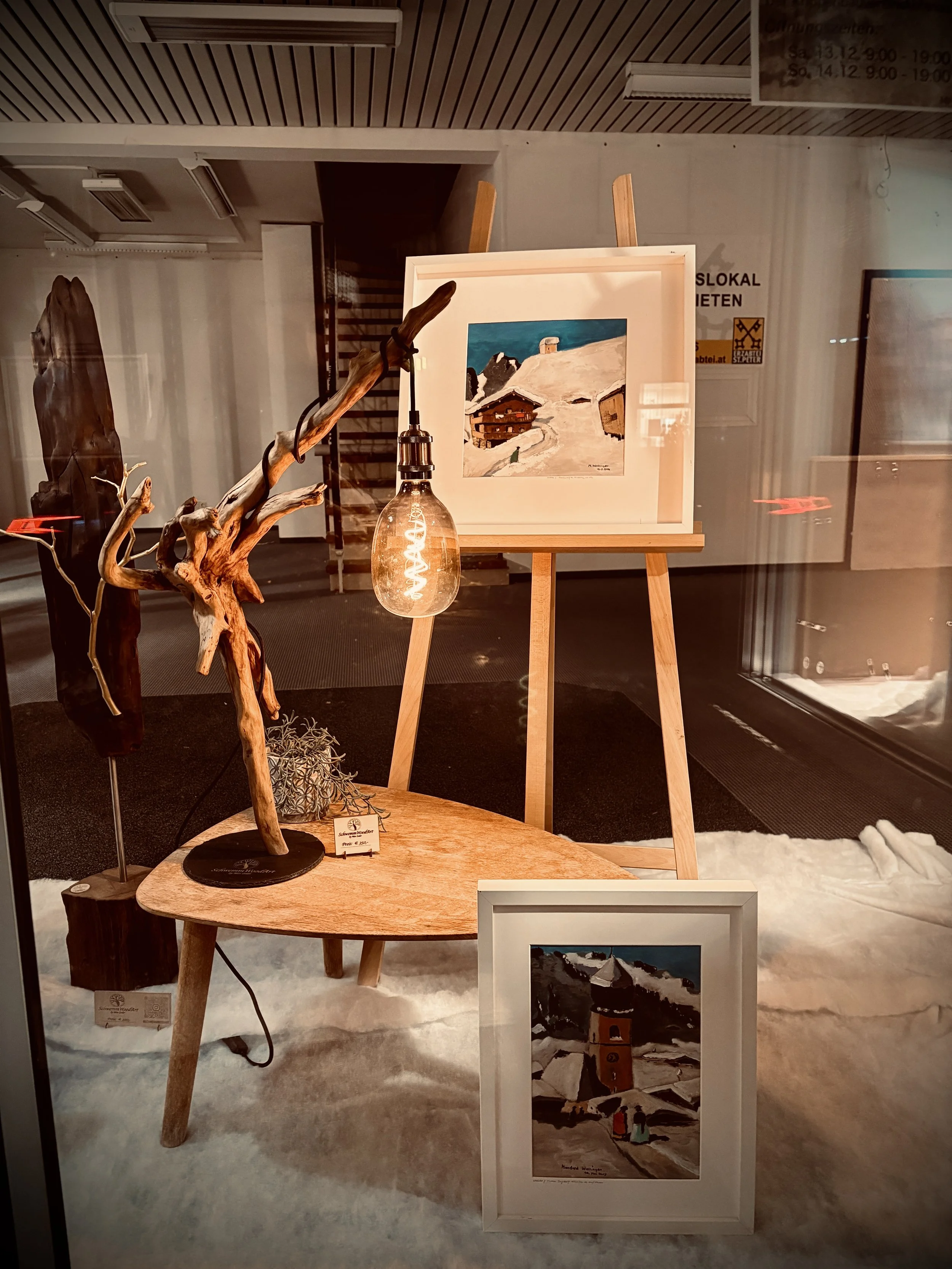 Schaufenster mit einem Gemälde, einem alten Lampenschirm an einem Holzstab, einem Paar Wanderschuhe, einem Becher, Postkarten und kleinen Schachteln.
