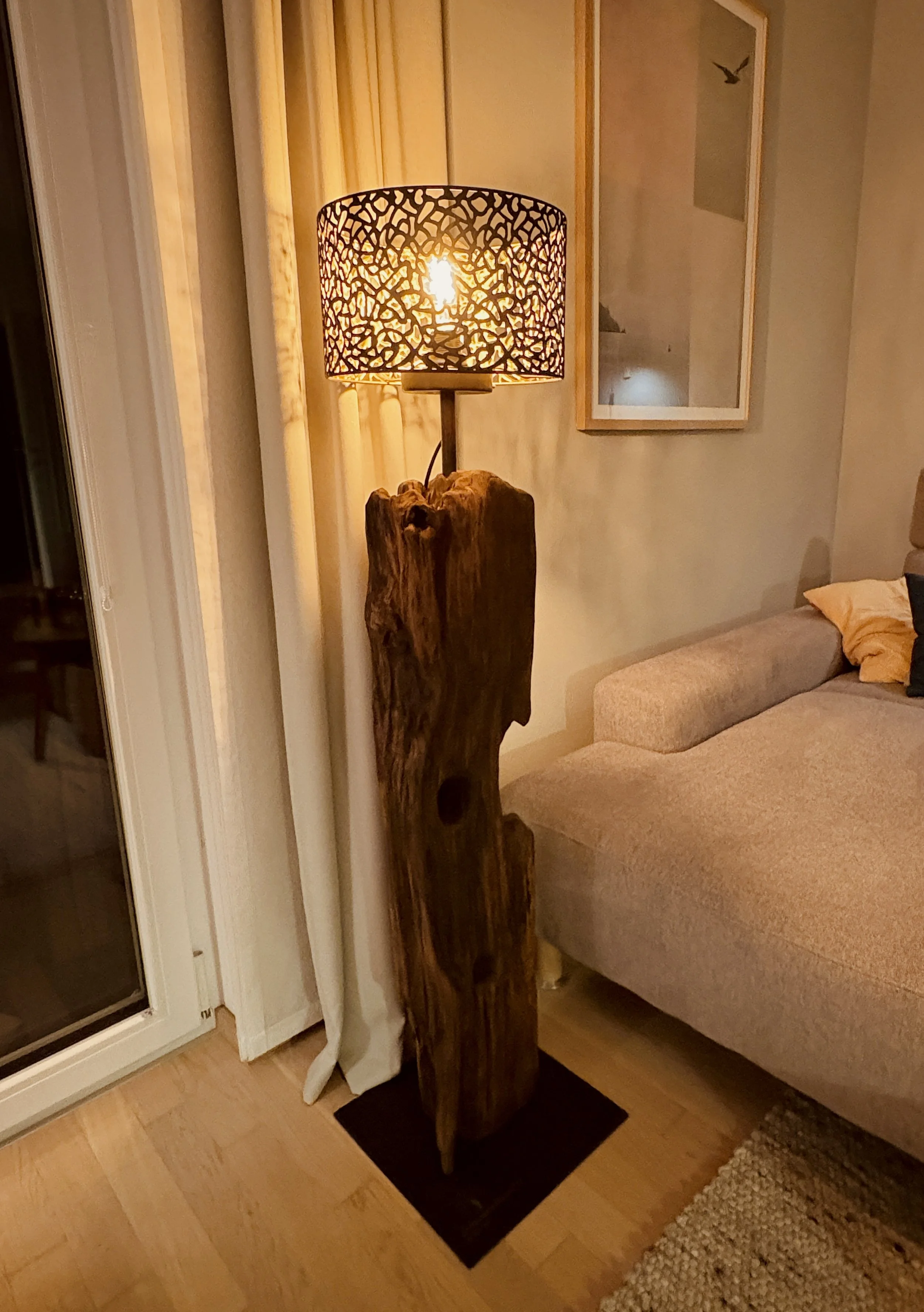 Eine Stehlampe mit einem Lampenschirm aus einem dekorativen Metallgitter, das auf einem Stück naturbelassenem Holz steht, in einem Wohnzimmer neben einem beige Couch.