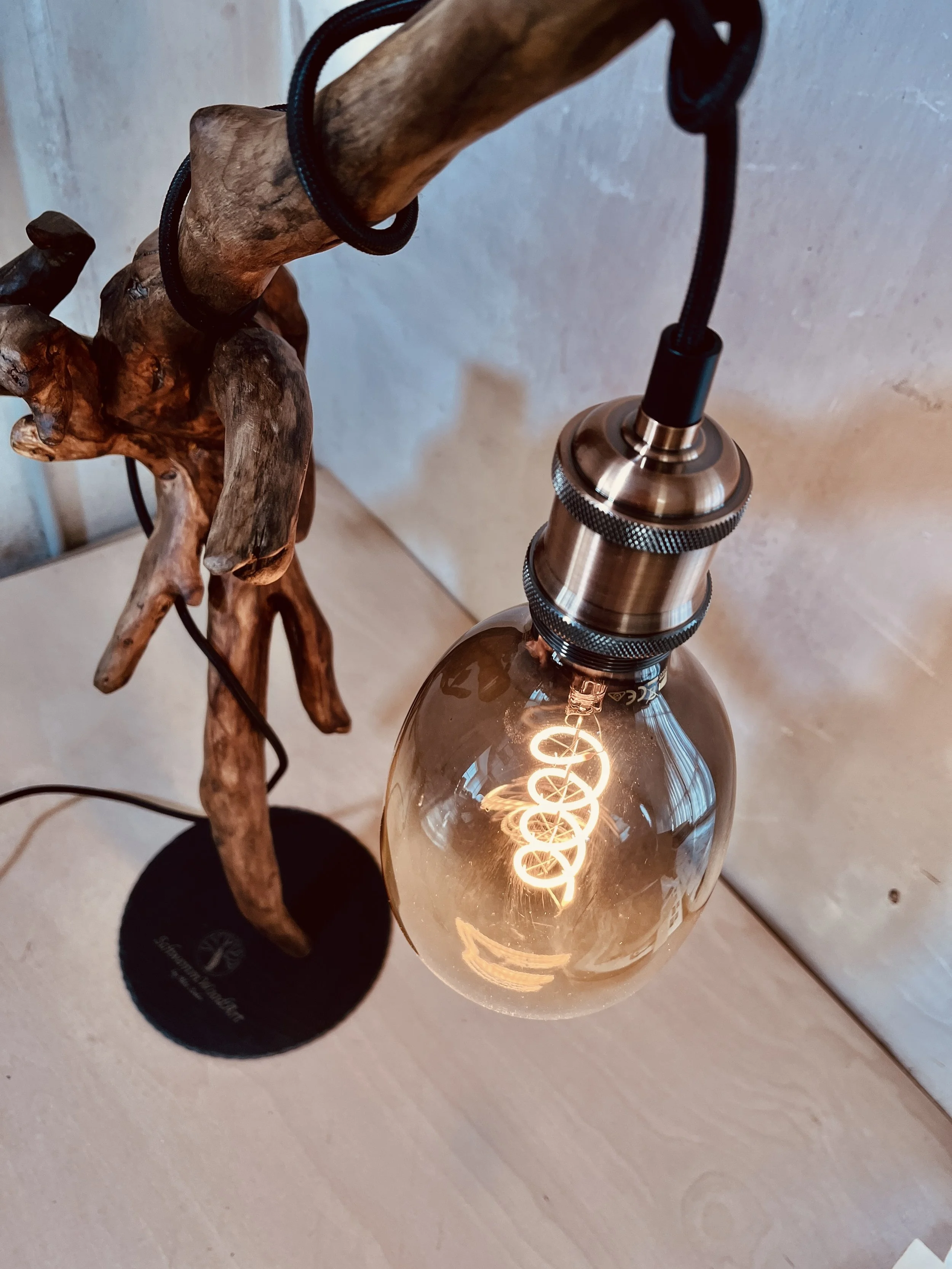 Lampe mit einem Holzstück als Basis und einem großen Glühbirnenkopf, der ein sichtbar gewickeltes Glühwendel enthält, hängt an einem schwarzen Kabel. Die Lampe steht auf einer Holztisch.
